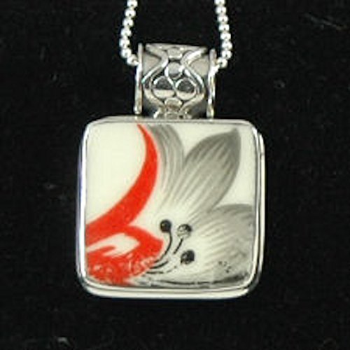 Orange and Black Flower This beautiful pendant is made from hand cut china and set with sterling silver to make a one-of-a-kind piece. This piece was carefully cut from the perfect old china dish and set in brilliant sterling silver by a skilled artisan. This unique item was created with fine china and sterling silver to create a timeless keepsake.