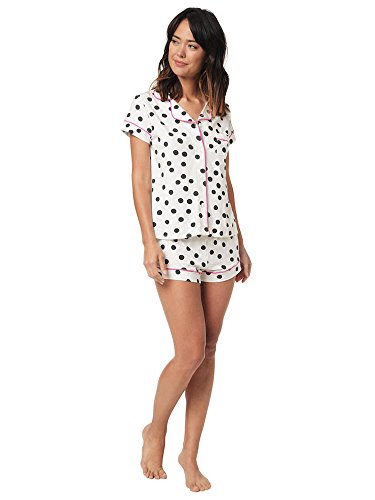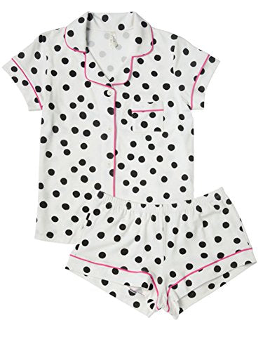 Sleep so cool and comfortable in this Polka Dotted button down PJ short set. We searched for the perfect knit fabric. These are hand-pulled Peruvian Pima cotton, which is known for its silky luster and unbelievably soft hand. We combined that with Modal to get the perfect drape and added Lycra to give it stretch and recovery so they look and feel great with every wear. These PJs are so luxuriously soft you'll never want to change out of them. This pajama set has a snugger fit than our woven PJs. But the stretch gives it the perfect fit every time. This pajama is pre-shrunk but WILL shrink another ~5% when washed. There will be no refunds on returns of washed items!