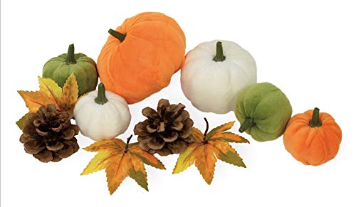 Made of Fabric, Foam, Plastic, & Pine-cones. These orange, green & white velvety-soft pumpkins in varied sizes are perfect for your seasonal decor. Paired with Fall Foliage and Pine-cone will finish off your tables-cape or mantel this season.