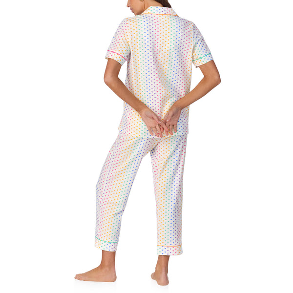 Our women's short sleeve cotton jersey cropped pajamas in an adorable white background with rainbow tiny hearts are comfortable and cute at home or on the road. Rainbow contrast knit piping at chest pocket, and notch collar elevate the style. Pull-on cropped with pockets, an elastic waistband wear easy all day or night.