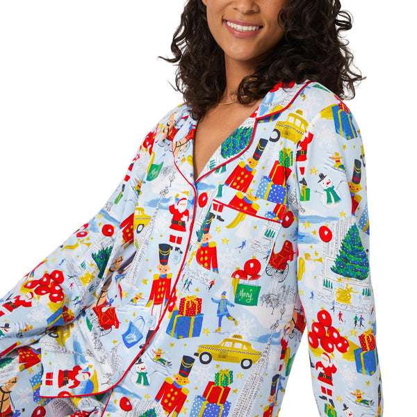 Generous fit, size down for a tailored look. Celebrate the charm of the holidays in the city with this festive long-sleeve PJ set. The print captures cozy scenes like skating rinks, caroling on street corners, and shoppers bustling past twinkling windows. Crafted from stretchy organic cotton jersey, it features contrast piping, a notch collar, and timeless tailoring.