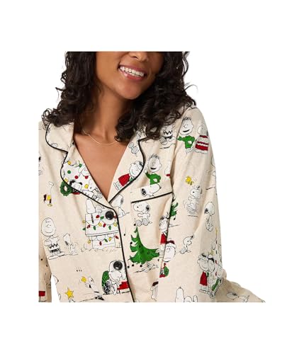 A timeless button-up silhouette meets nostalgic charm in this women’s Peanuts® pajama set. With piping detail and a relaxed tailored fit, it’s the perfect mix of festive and cozy. The ultra-soft jersey fabric is ideal for sipping cocoa or wrapping gifts.