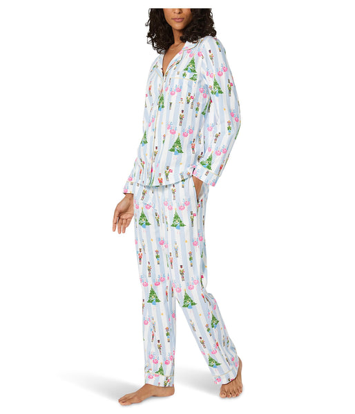 This full-length PJ set features a festive stripe print in soft pinks, blues, and creams—reminiscent of sugar plums and peppermint dreams. Crafted from breathable organic cotton jersey with a touch of stretch, it’s finished with a notch collar, gold glitter piping, and timeless tailoring.