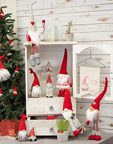 Add a touch of whimsical Christmas charm to your home with this cute gnome figurine. Made of quality felt material and intricate detailing. Measures approximately 4 x 6. 5 x 26-inches tall. Decorative fabric gnome has charming red heart on his hat; weighted bum helps him sit on edges to let his long legs dangle. Tibble gnome's nose peeks out underneath his tall pointy hat and white beard; gnome dons red outfit with red and gray striped legs and arms Perfect for displaying on a shelf or mantel as a fun holiday decoration. Ships in protective packaging for easy gifting and storage.