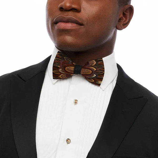 The Pheasant feather bow tie combines varying shades of black, almond, and brick red with hints of umber. Layered with authentic pheasant feathers, this design is the real deal —dangerously dapper with rustic appeal. Center wrap is black grosgrain.