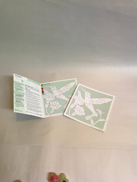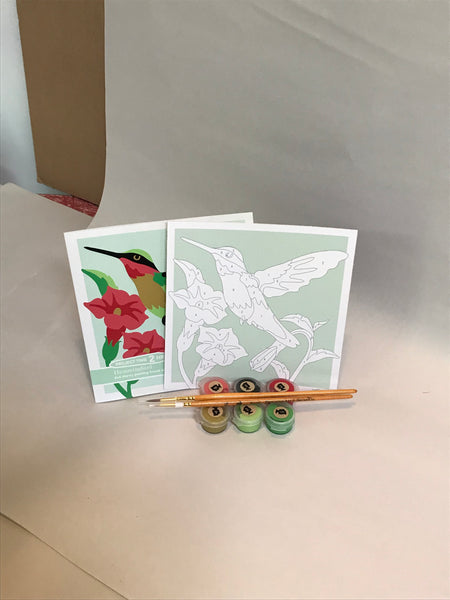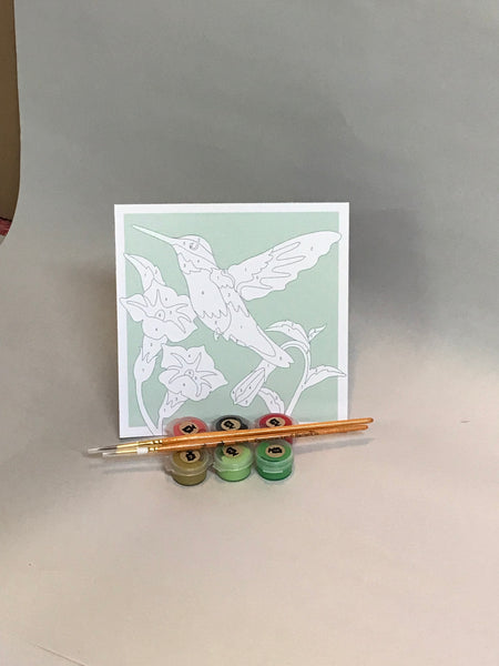 Hummingbird mini paint-by-number kit (6x6 painting board) depicts a gold-breasted hummingbird with brilliant red and green feathers buzzing about some nectar-filled Trumpet Creepers. This kit features gold metallic paint! The preprinted background sets this tiny, winged wonder against pale blue with a white border. Completing the acrylic painting can take between 1-2 hours. These DIY craft kits are recommended for adults or children aged 13 and older.