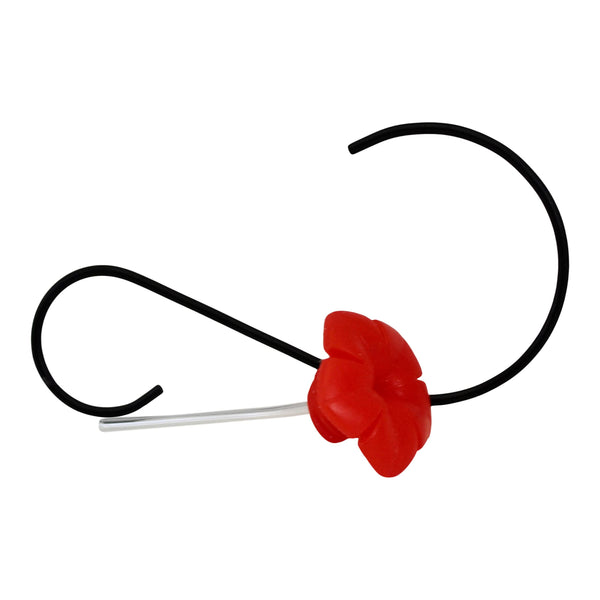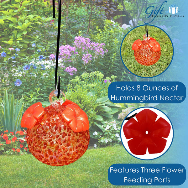 This hand-blown glass hummingbird feeder holds 8oz of nectar. Blossom ports are made of rubber with a plastic tube insert and can be easily removed for cleaning. Each feeder comes with a s-hook to conveniently hang the feeder.