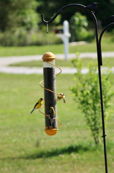 Designed with Goldfinches in mind, our 17" Spiral Thistle Feeder features 18 ports so more birds can feed at once. The exterior spiral allows birds to move from port to port instead of flying to another perch. The tube holds a generous 2.5 quarts of thistle. The tube is made of super long-lasting UV-stabilized polycarbonate. Parts are durable aluminum and stainless steel. This feeder has a patented (US patent 6,213,054) squirrel-resistant locking top cap-just twist to lock. The bottom cap twists completely off for easy cleaning. These lids allow you to fill from each end so you can easily rotate seed when filling to keep it fresh. The feeder also includes an attached easy to hang looped heavy duty wire cable. Available in green, yellow and copper finishes.