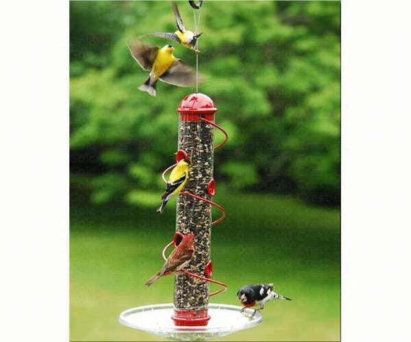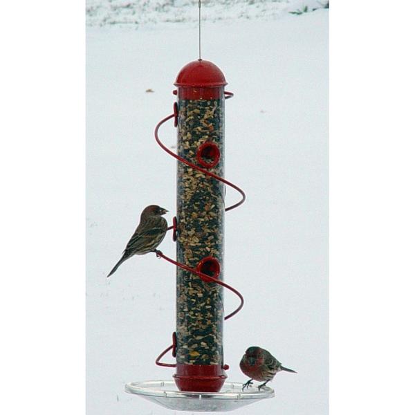 17.5 in. Red Mixed Seed Spiral Feeder. Consumers and birds LOVE patented Songbird Essentials' Spiral Feeders! More ports means more birds. Birds love to Run The Spiral instead of flying to another perch. Spiral allows Cardinals, Grosbeaks and other desirable large songbirds to feed. With normal perch tube feeders, these birds have difficulty feeding without a seed tray. Aluminum and stainless steel parts. Squirrel-proof- patented locking lid- just twist and lock those pesky varmints out. Easy to clean- twist and clean (patent pending) easy-clean bottom comes completely off for easy cleaning. No screws to mess with. Easy to hang- looped wire hanging cable included (150 lb. test) and attached. Holds cap so you don't have to wonder where you put it. Feeders come completely assembled (in beautiful open view box.) Take out of the box, hang in your yard, and watch how fast the birds are attracted to the patented Spiral Perch. 2.5 Quart capacity (1.5 pounds). Tray in photo (SEBQSBFTRAY) NOT included. Use the SESQ83 Hanging Baffle to help protect your seed and feeder from squirrels and weather.