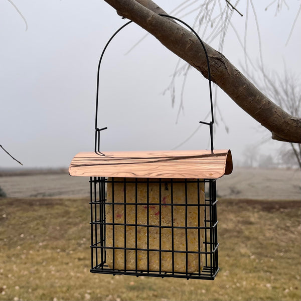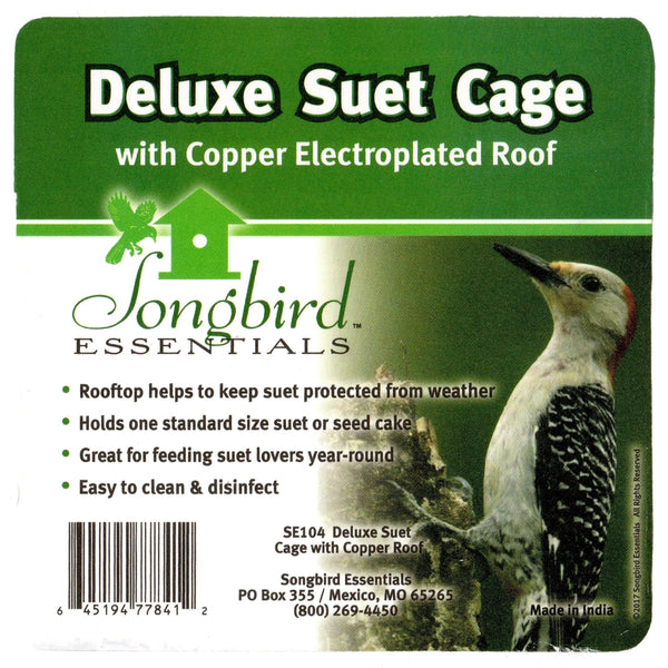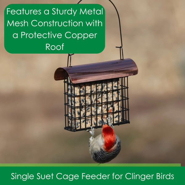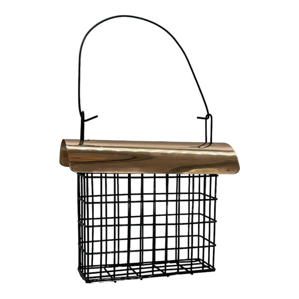 The Deluxe Suet Cage with Copper Electroplated Roof holds one standard size suet or seed cake. Rooftop helps to keep suet protected from weather. Great for feeding clingers year-round. Easy to clean and disinfect.