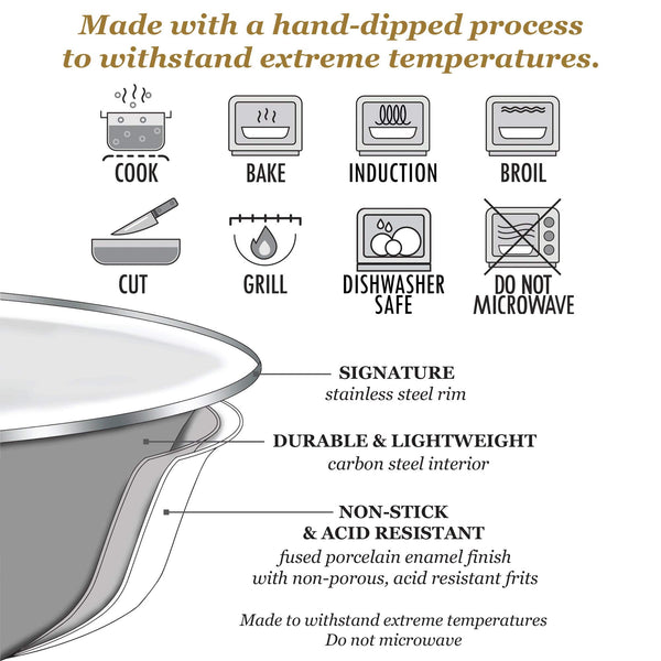 This enamelware is made of carbon steel coated with a porcelain enamel and trimmed in stainless steel. There will be variations in the shading of colors and pattern formations which are the results of the hand-dipped process.