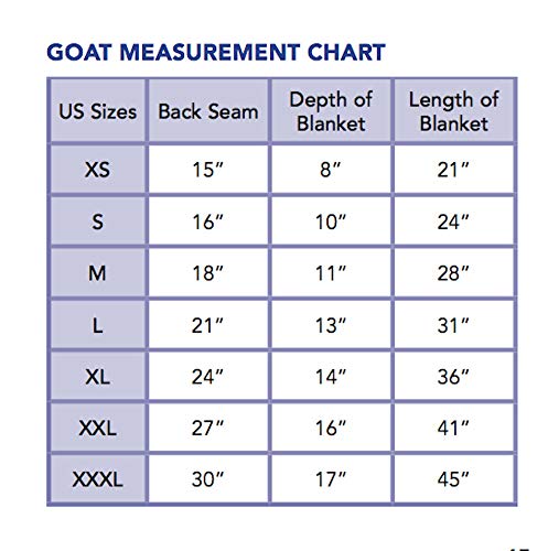 This durable goat coat is made of 600D waterproof, windproof and breathable fabric with a coat polishing, poly-nylon lining and 100g of fiberfill for warmth. This blanket features an adjustable neck closure, belly closure, leg straps, a contoured rear and Velcro fastenings to ensure comfort and a proper fit. The belly closure is fastened on the inside to keep fellow "friends" from unfastening. Reflective strips give added protection for ease of identification after dark. This cover is adjustable by approximately 4" to accommodate different necks and thickness of girth. To determine sizing measure back from base of the neck down to the tail. NOTE: SIZES WILL VARY WITHIN 1".