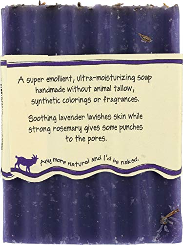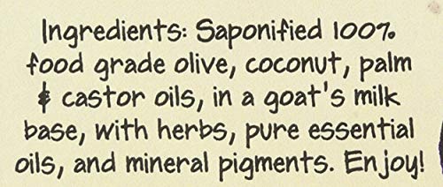 Plenty strong for a satisfying cleanse, yet luscious enough to make you question whether or not you skipped straight to dessert. Makes your skin feel even sweeter than it smells. What's inside? ingredients you can pronounce. Saponified 100% food grade olive, coconut, palm & castor oils, in a goat's milk base, pure essential oils, and mineral pigments. Lavender brings the sweet ambrosial and floral flights, while rosemary punches your nose in camphoric and woodsy hooks.