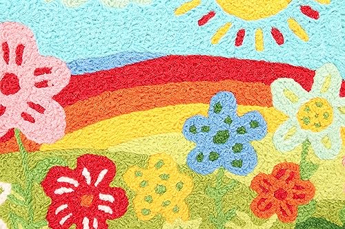 Approximately 20"x 30"; Rug Content: 100% Polyester; Backing Content: 100% Polyester; Indoor/ Outdoor Rug; NEW Jellybean rugs are bright, fun, and colorful! All Jellybean rugs are machine washable! When something is spilled on a Jellybean it lives up to it's famous tagline; "washes better than your jeans"! Throw your Jellybean in the wash and watch it come out good as new! The beautiful and bright colors were made to last through many, many washes. Even outdoors on your porch or patio, your Jellybean rug will stand up to heat, cold, and won't fade in the sunlight.