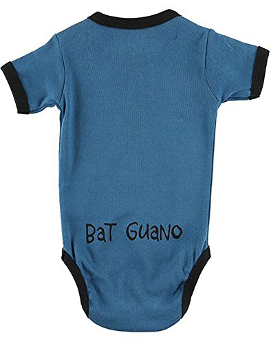 Our infant creepers are perfect for innerwear and outerwear--”any-wear!” Made from 100% ribbed cotton, creepers fit snugly with a comfortable stretch and conveniently snap at the crotch and shoulder! This bodysuit is a dark blue color with a black bat on the front, His eyes GLOW IN THE DARK. The front says "I sleep in the dark" The back says "Bat Guano" 100% Cotton - This item is NOT preshrunk - no returns once washed* Please buy accordingly