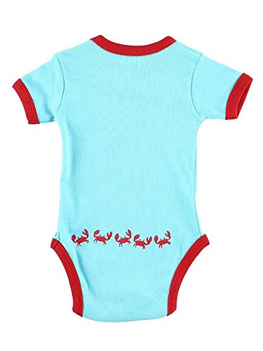 Our infant creepers are perfect for innerwear and outerwear--”any-wear!” Made from 100% ribbed cotton, creepers fit snugly with a comfortable stretch and conveniently snap at the crotch and shoulder! A turquoise crawler with red trim and a crazy little crab on the front. The front says "Sometimes I'm a Little Crab!" The back has crab prints across the bottom. 100% Cotton - This item is NOT preshrunk - no returns once washed* Please buy accordingly