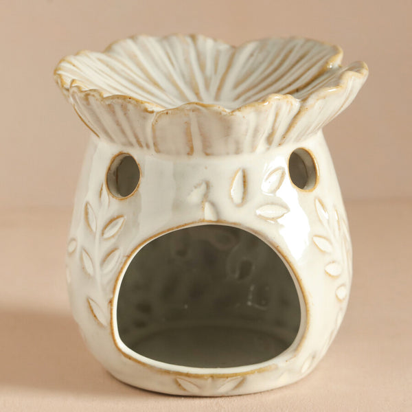 Made from glazed ceramic painted in soft cream and beige, this sweet little burner features a unique floral pattern around the sides. Also depicting a chunky bumblebee among the foliage at the back of the burner, the top features an open flower design for the wax melt dish, completing the cottage garden theme. Simply pop your favorite wax melts or a few drops of fragrance oil with water into the flower-shaped dish at the top and place a lit tealight candle in the open mouth of the burner. The candle will soon begin melting the wax or warming the oil and your home will be filled with your choice of fragrance.
